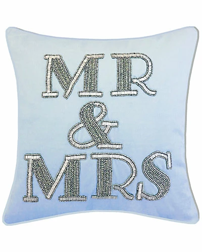 - Make treasured moments last a lifetime with the Celebrations Collection by . With an array of chic styles to choose from, you can be sure to find the perfect decorative throw pillows for the perfect couple. Each plush pillow makes a unique, thoughtful gift for newlyweds or to commemorate your own wedding, anniversary or milestone. This throw pillow showcases eye-catching “Mr & Mrs” beading over a rich light blue ground. Measures 18×18. Front: 100% Polyester exclusive of decoration; Back: 100% Cotton. Convenient zipper closure. Easy spot clean.